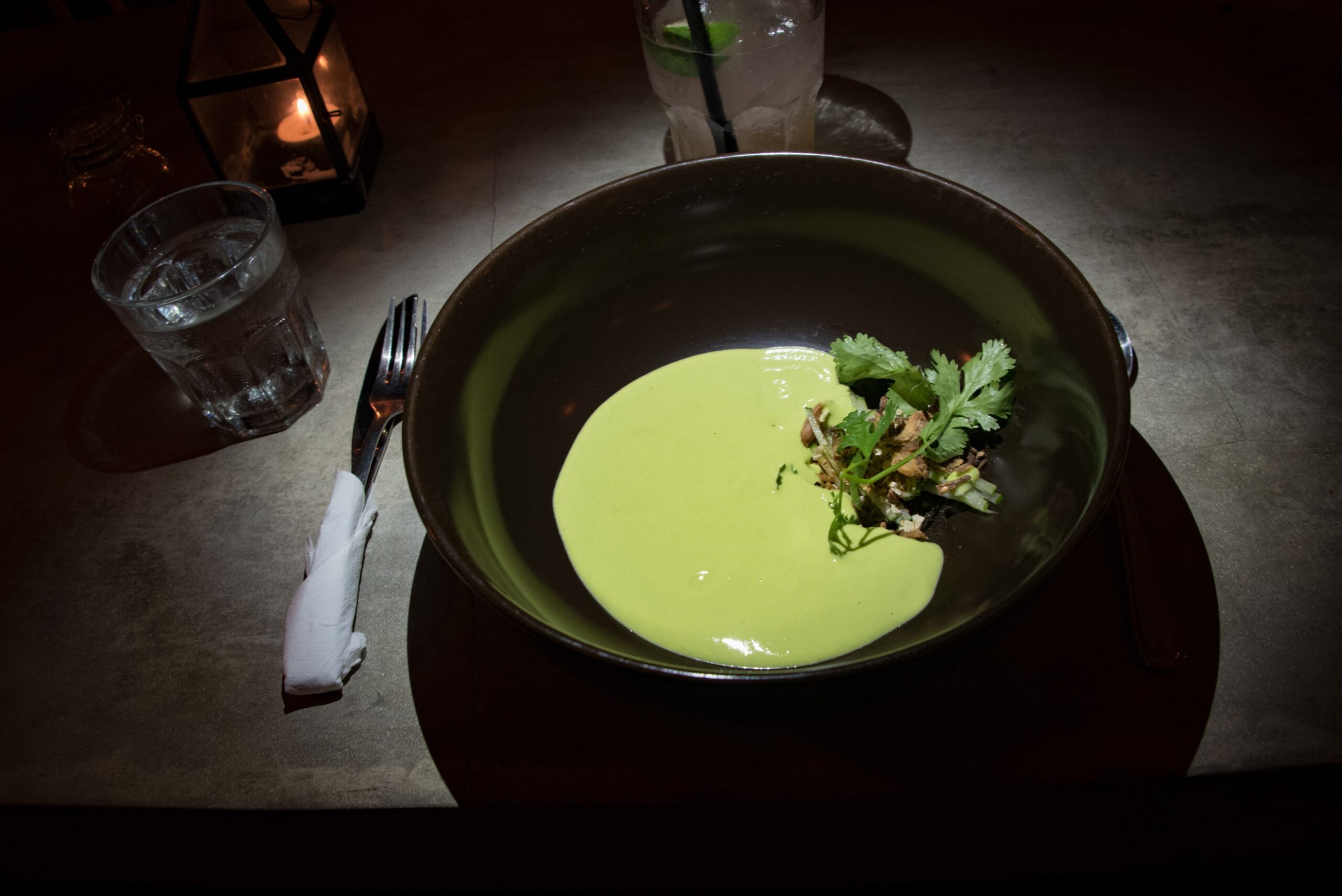 First: a pea gazpacho. It’s served cold, of course. I think it’s superb. It’s light, there’s barely any seasoning which, in this case at least, suits the dish very well, and it’s smooth and cooling. A light way to start a meal!