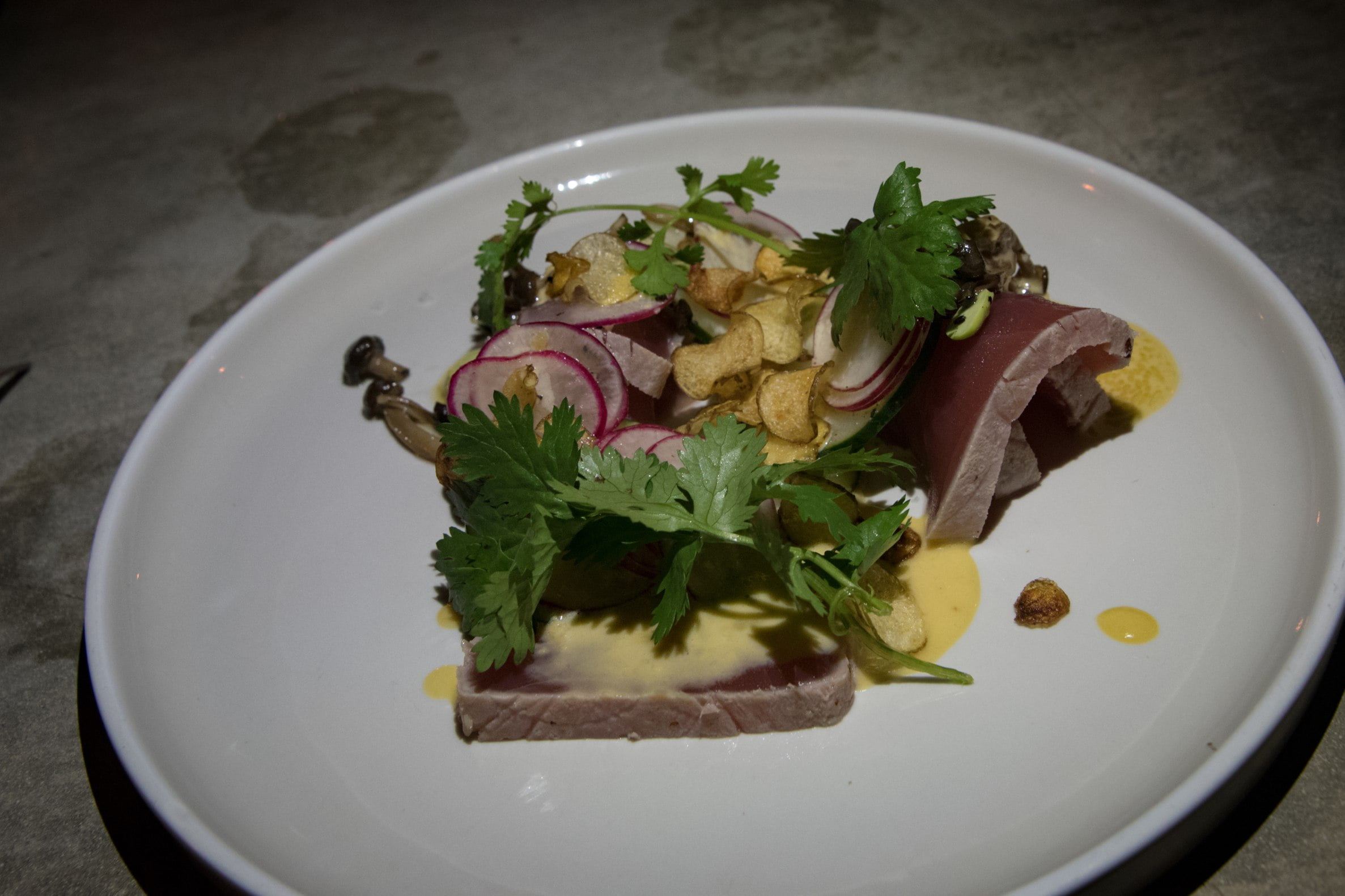 Next, a tuna tataki dish with edamame, cucumber, radishes, a couple of mushrooms and a ginger aioli. This sushi-grade tuna is barely seared on the outside, more akin to sashimi than tataki. Listen, I definitely have a parti pris for tatakis and sashimis, and I especially love these raw pieces of fish when they’re flawlessly fresh, barely seasoned and paired with other items that don’t steal the show from this extremely light-tasting protein. So, yeah, this is simply great food.