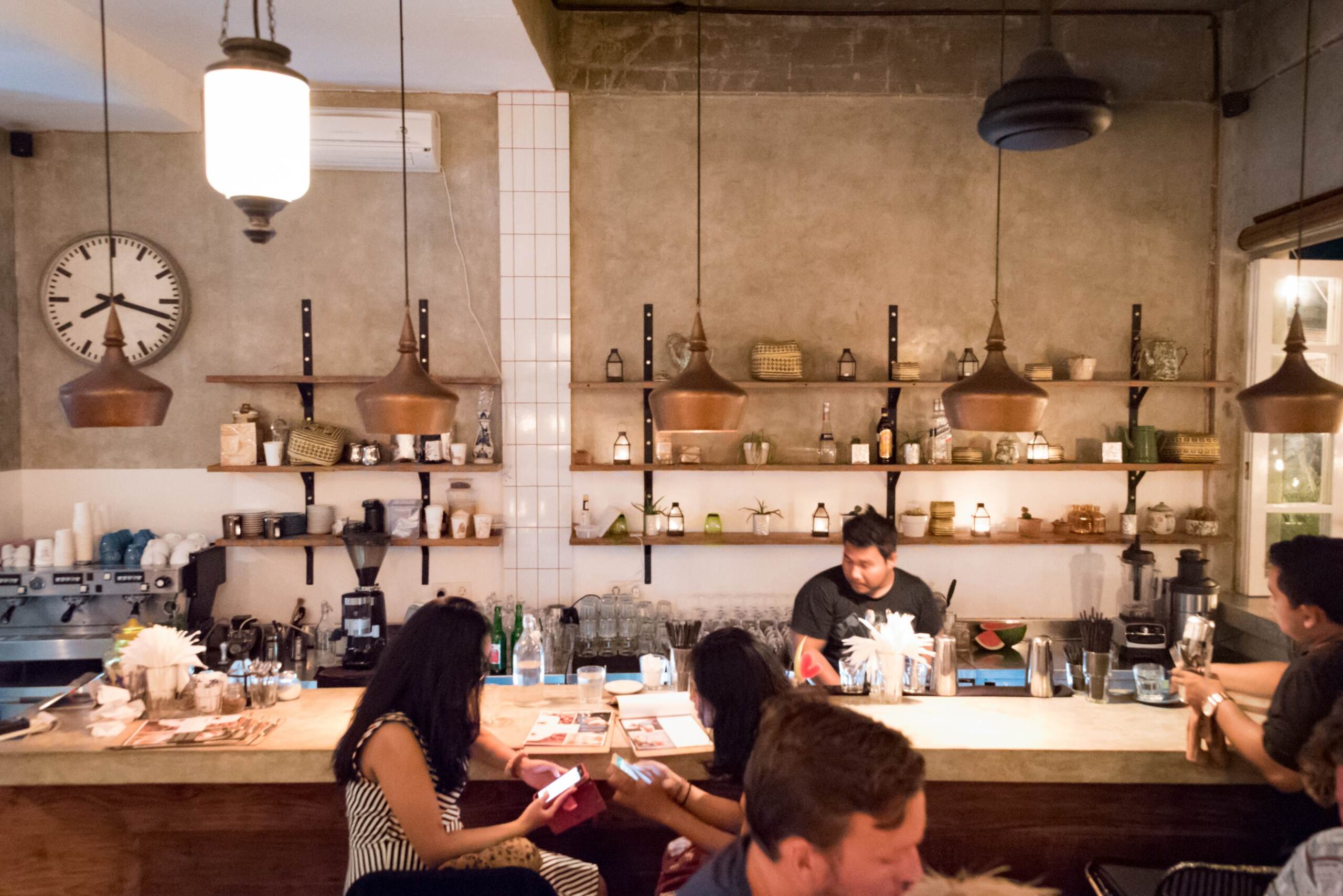 Should I eat inside or outside? The weather is – obviously – perfect and there’s a slight cooling breeze. It inspires you to go out and explore the hidden spots in Bali. But the design inside is nice to look at, too! “Why not both?” Kevin Latrem suggests that I sit at the windowsill, where a large concrete counter has been built. That way, I can sit right in between and sip a very nice watermelon gin fizz.