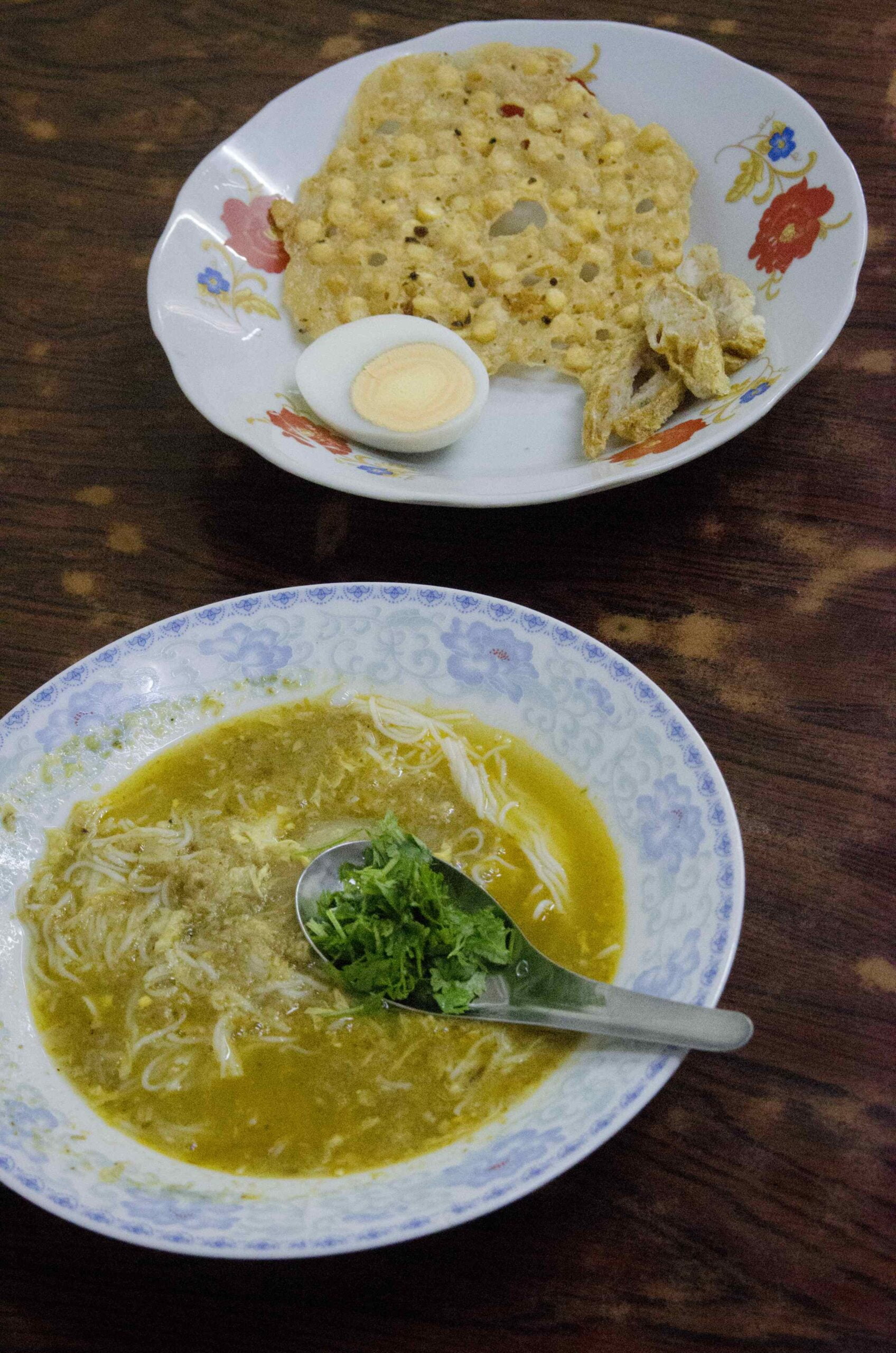 Il s’agit d’une soupe épaisse de bouillon mystérieux (est-ce du poulet? du pigeon?) et de vermicelles de riz avec un gout de citronnelle et de persil. La soupe est accompagnée d’un demi-œuf cuit dur et agrémentée d’un craquelin de semoule de maïs avec quelques grains entiers, qu’on brise dans la soupe pour donner du croquant. On y ajoute des morceaux de faux porc fait de tofu, puis on assaisonne à notre goût de condiments de pâte de crevettes fermentée, de lime et de flocons de chilis déshydratés.