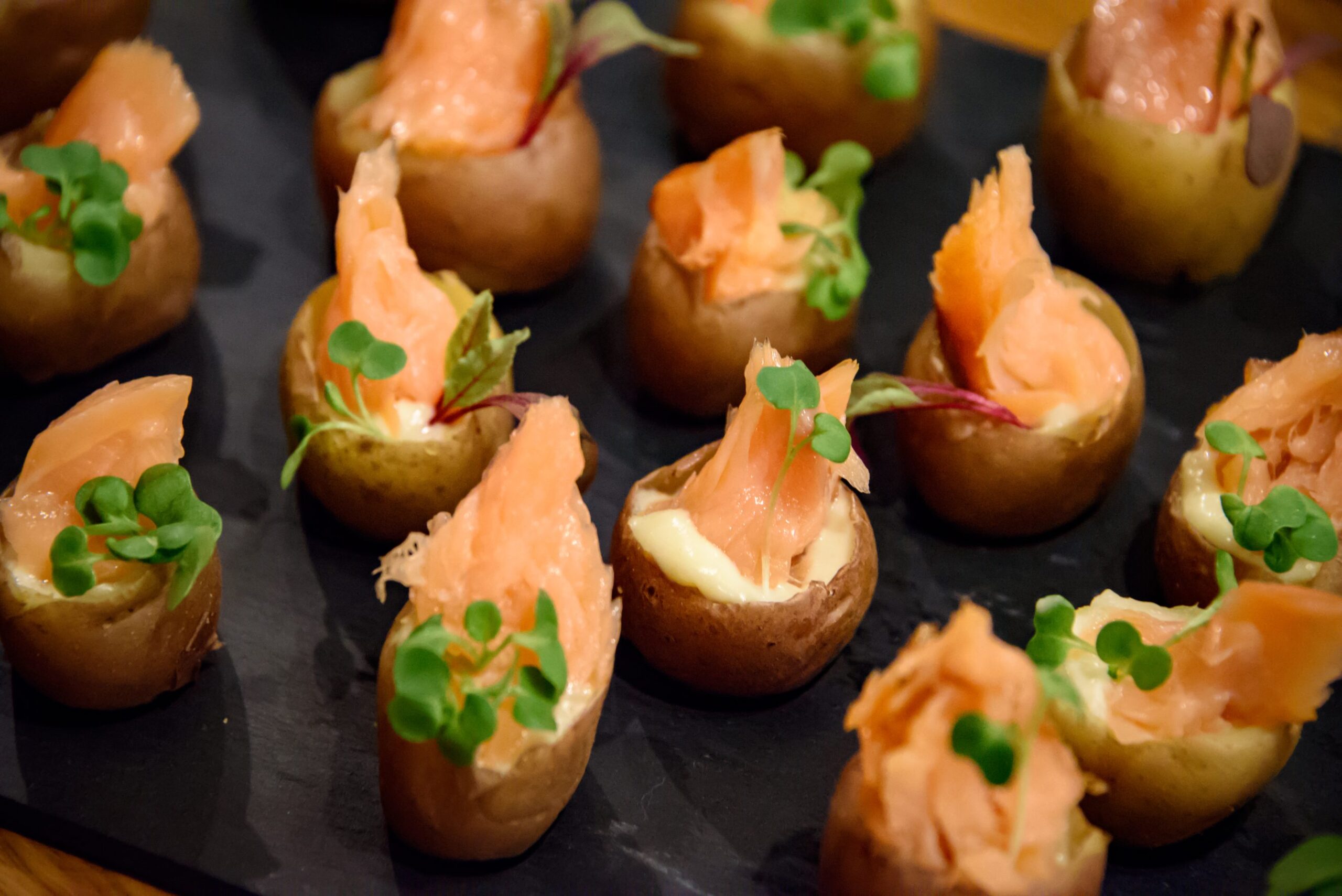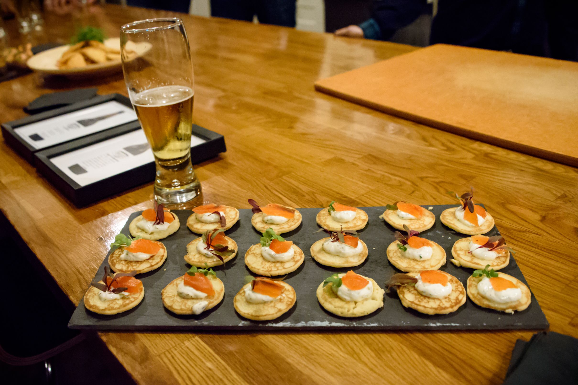 Chef Garnier nous a ensuite proposé des bouchées au saumon qui devaient aller avec de la Stella Artois: gravlax, saumon fumé à chaud, samosas.
