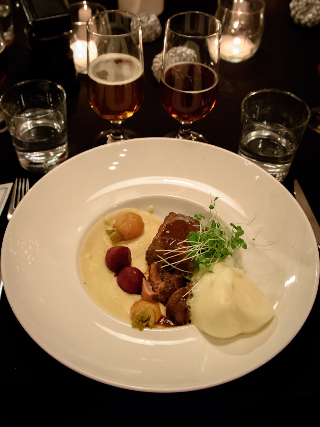 Après nous avoir invités à prendre place aux tables arrangées pour l’événement, un plat combinant du porc et du bœuf braisés, une purée de légumes, betteraves et mousse d’agrumes était suggéré avec les produits Goose Island: la India pale ale et la Honkers ale.
