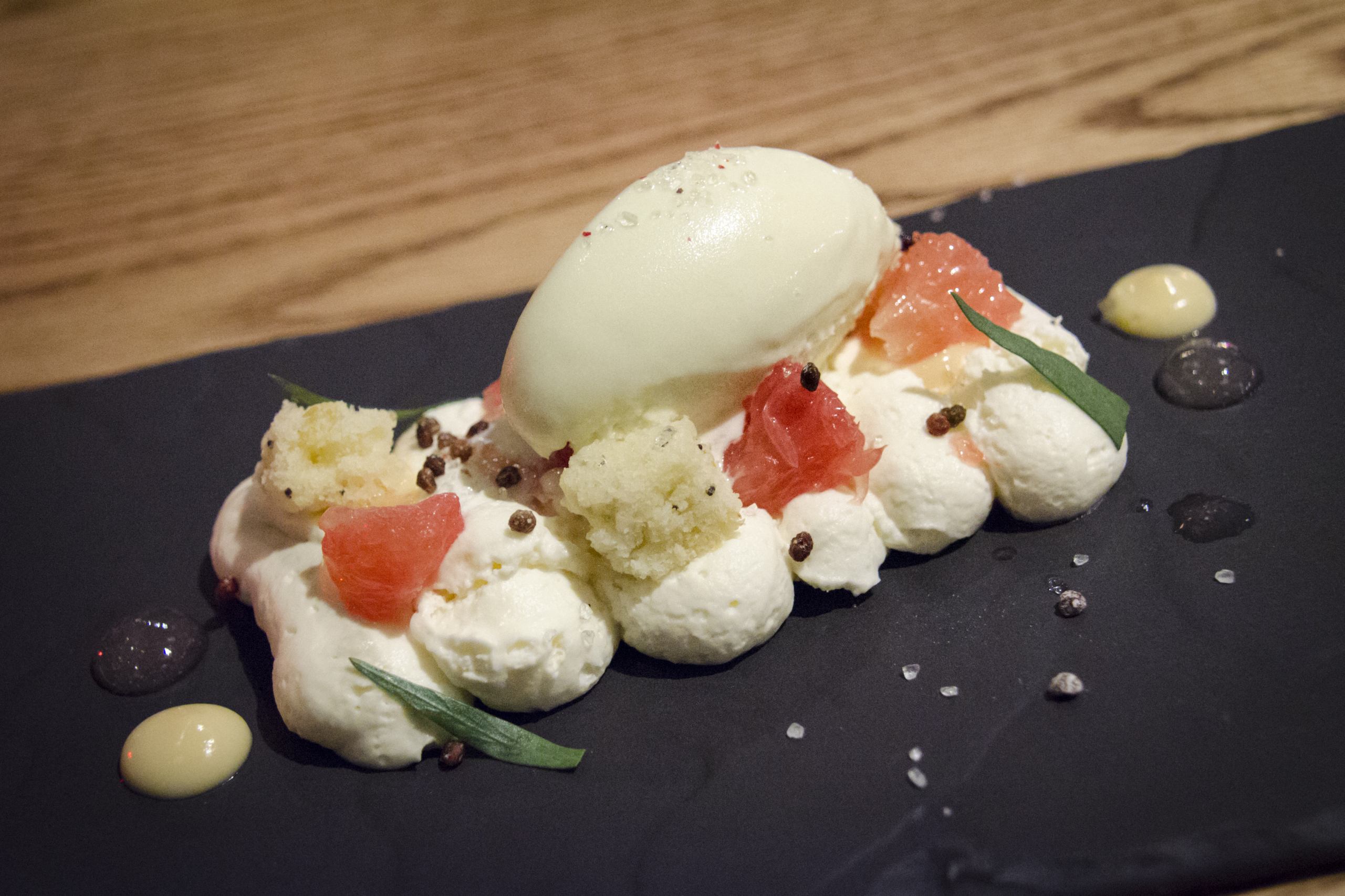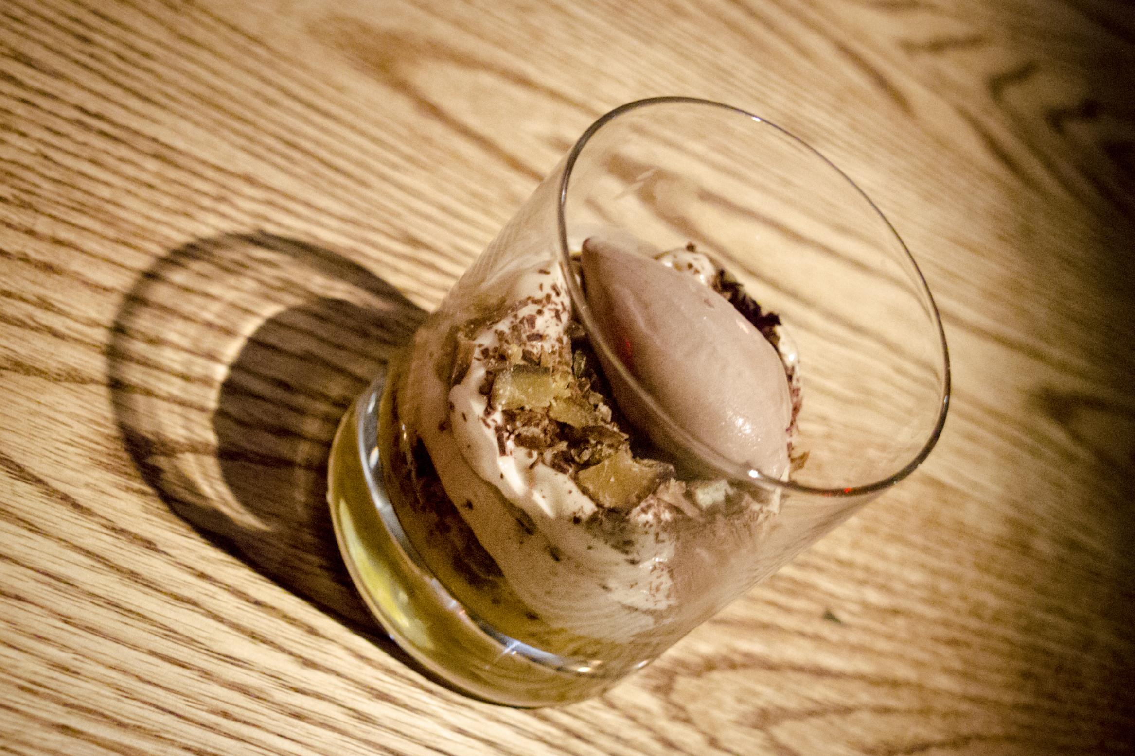 Le « chocolat blanc fouetté » accompagné d’une quenelle de crème glacée à l’estragon offrait un beau contraste sucré-herbacé et le « sablé breton au chocolat » et sa quenelle de crème glacée à l’espresso étaient tous deux servis d’une manière originale – le premier sur une ardoise, le deuxième dans un verre lowball – et encore une fois, la délicatesse des saveurs faisait contraste avec l’impétueuse ambiance de bar qui battait son plein.