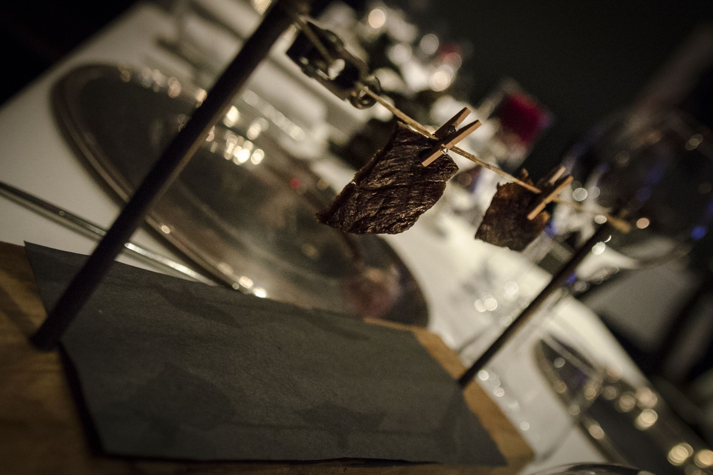 Quelques bouchées nous sont présentées. Entre autres, un beef jerky maison, hyper moelleux, est servi « sur la corde à linge ». Bien meilleur que Jack Link…