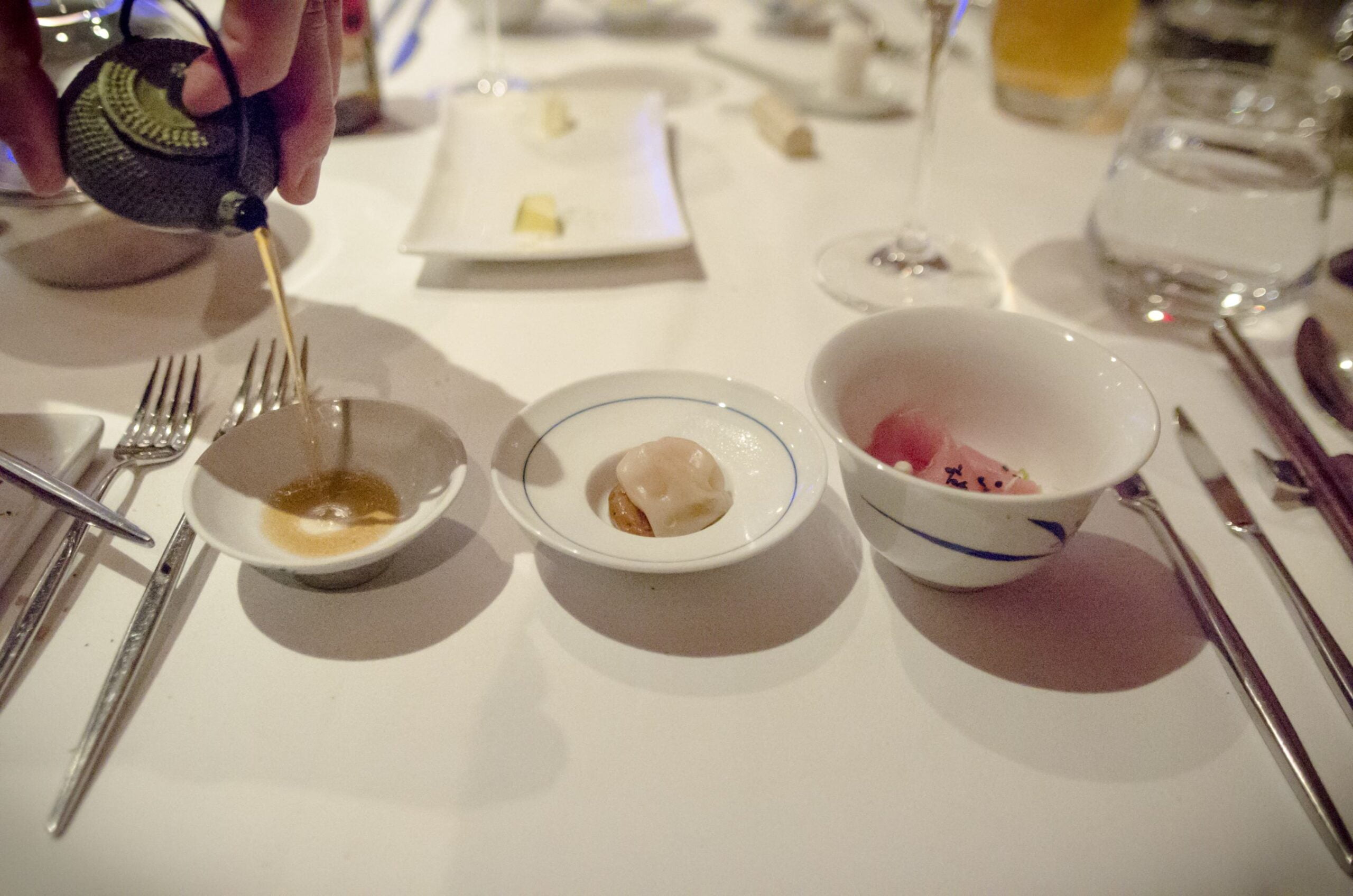 Aussi, un dumpling de crevette est assis sur une purée de crevettes, servi avec un bouillon et quelques sashimis de thon albacore. Il s’agit ni plus ni moins d’un amalgame de plats classiques de différentes régions de l’Asie présentés à la Française.