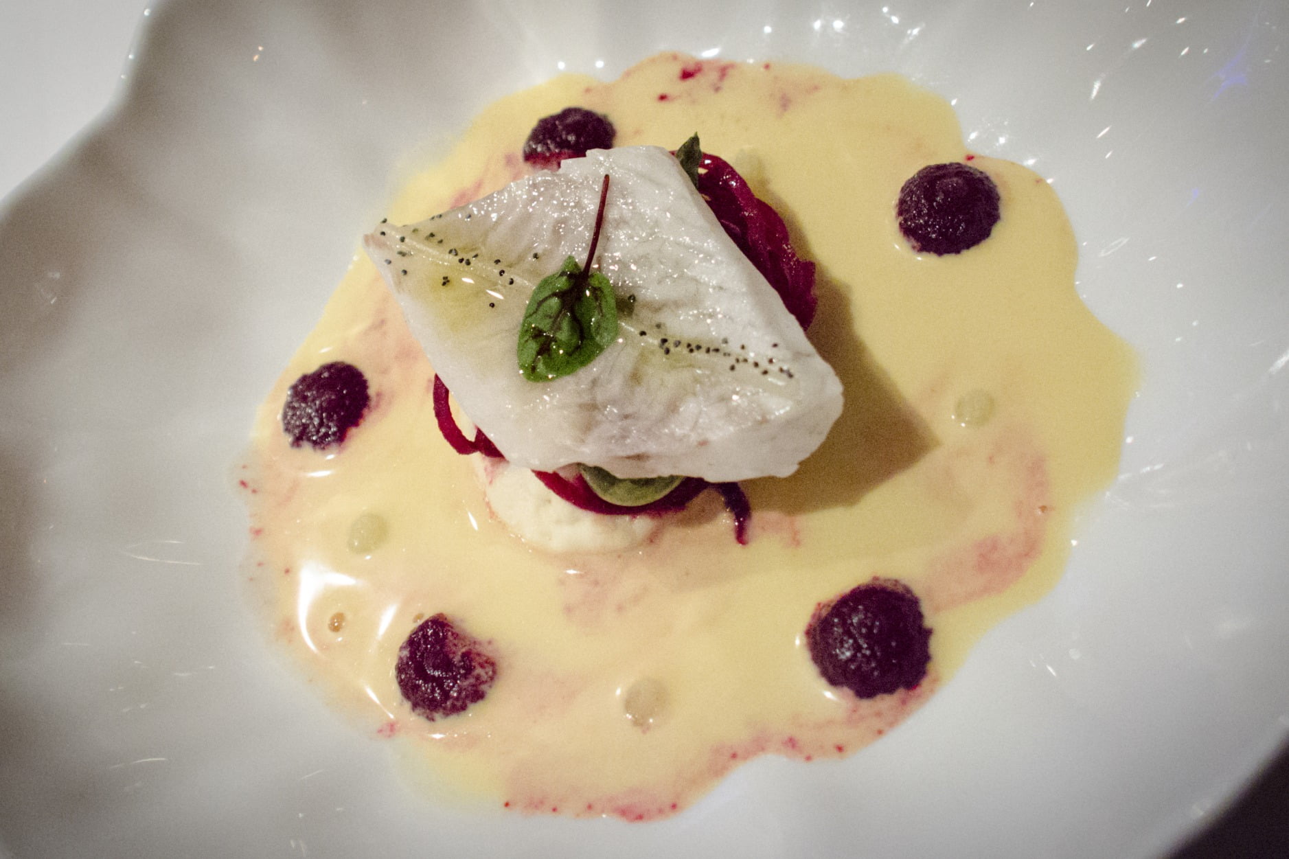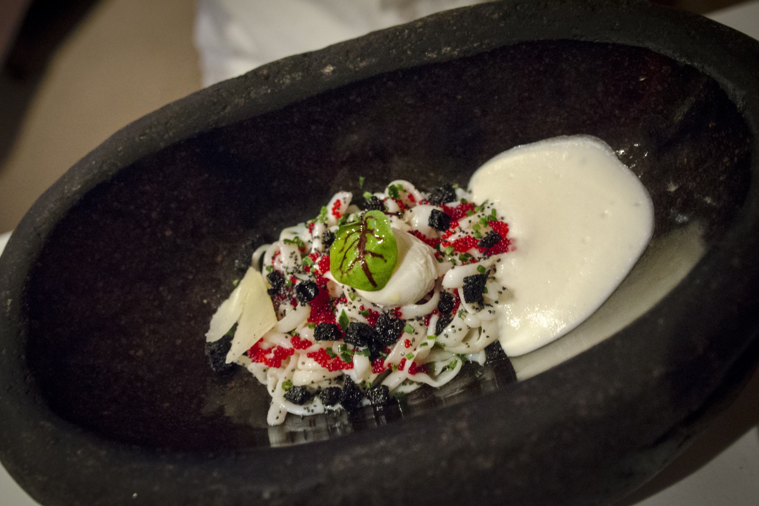 De minces tranches de calmar citronné sont couvertes d’un œuf de caille poché et de ce qui semblent être des œufs de poisson, rouges et noirs. Il s’agit probablement d’un des plats les plus réussis, d’ailleurs: les textures sont surprenantes et vivifiantes.
