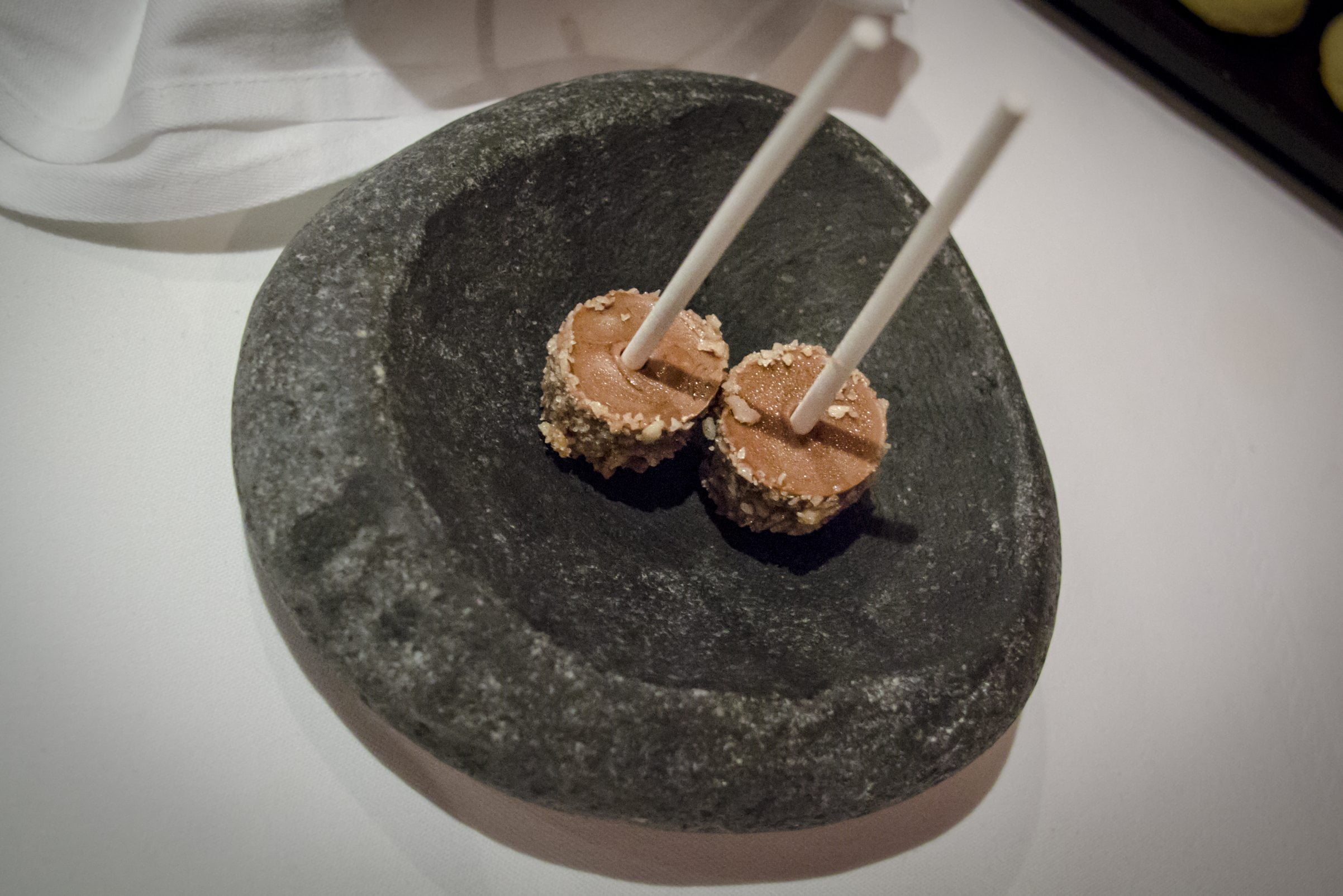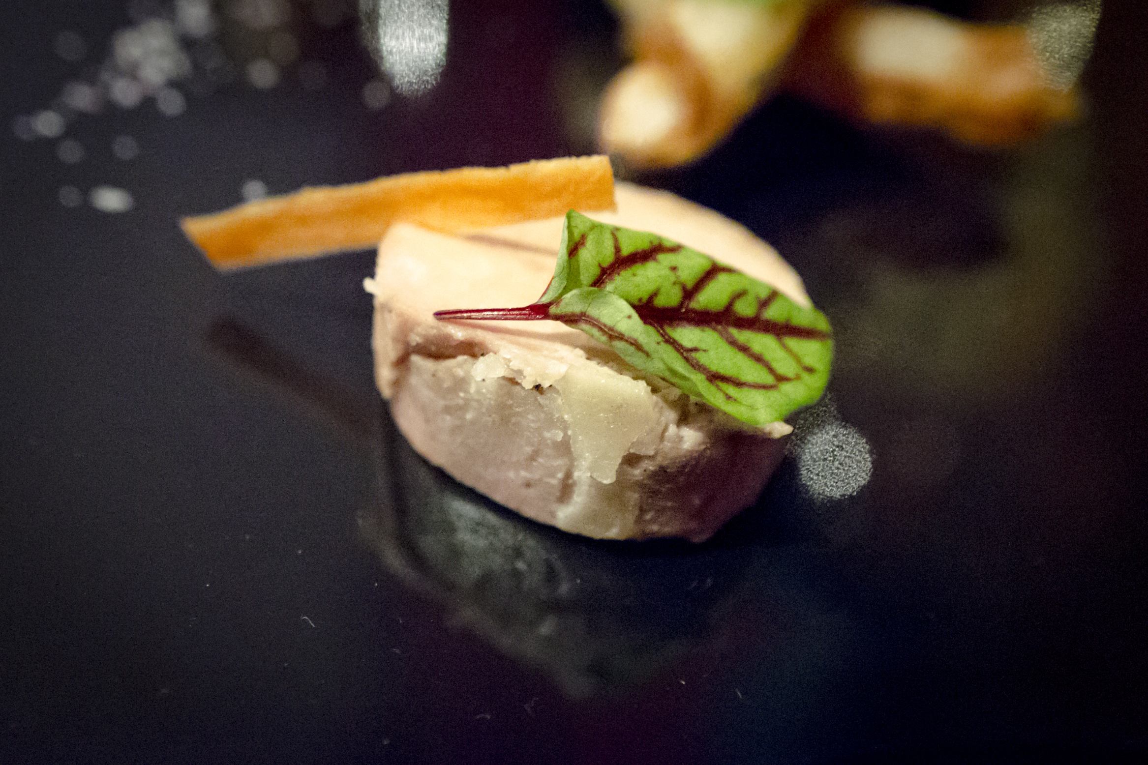 Ensuite, deux petites rondelles de torchon de foie gras à côté de quelques grains de sel sont servies avec deux mini-rouleaux frits de langoustine. J’ai bien aimé, mais je me demande pour quelle raison le sel était-il à côté. Le chef voulait-il faire plaisir à ceux qui ont une diète faible en sodium? Pour se nettoyer le palais suite à ce plat très gras, le foie vient avec un shot de smoothie carotte-gingembre-pomme, avalé à l’aide d’une paille.