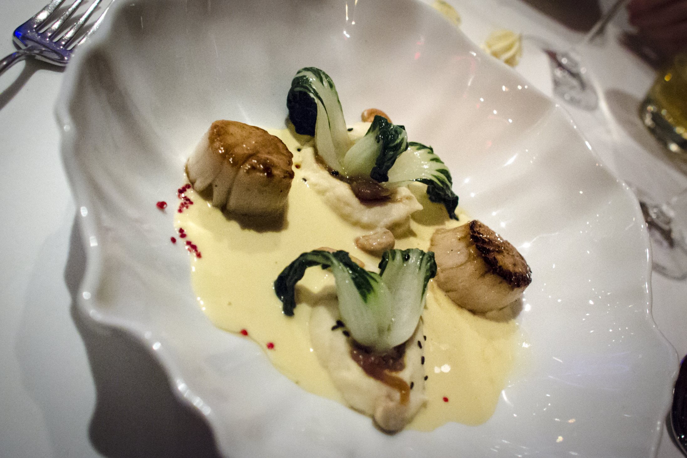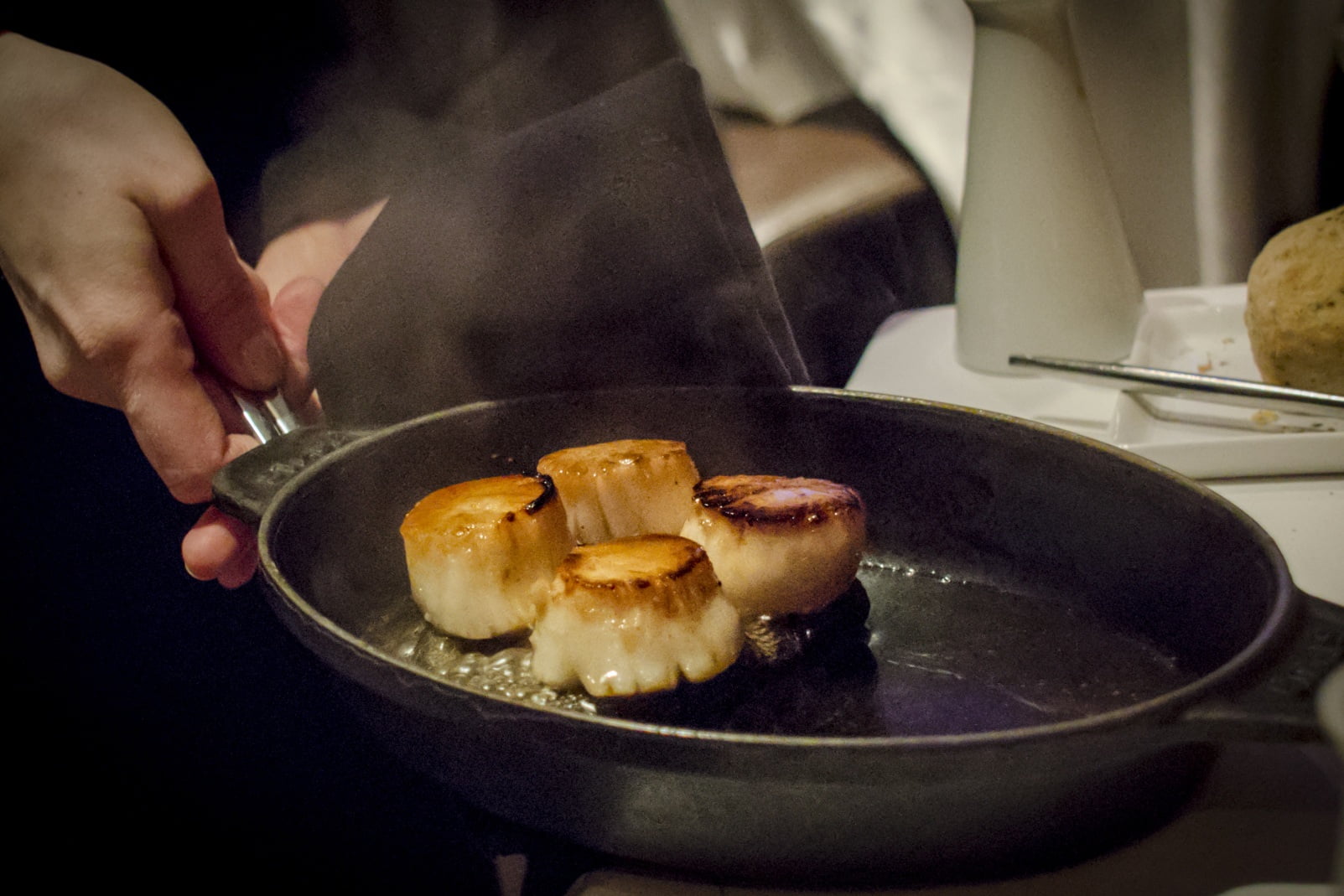 Puis, les plats principaux: les pétoncles sont saisis sur un galet de rivière brûlant à la table par la serveuse. Puis, la sauce est versée sur le galet, créant un nuage de vapeur odorante autour de la table. Des bok-choys braisés sont artistiquement placés sur l’assiette et les pétoncles sont répartis autour, à équidistance des autres items. La qualité des pétoncles ne ment pas, et le petit spectacle « table-side » est toujours divertissant.