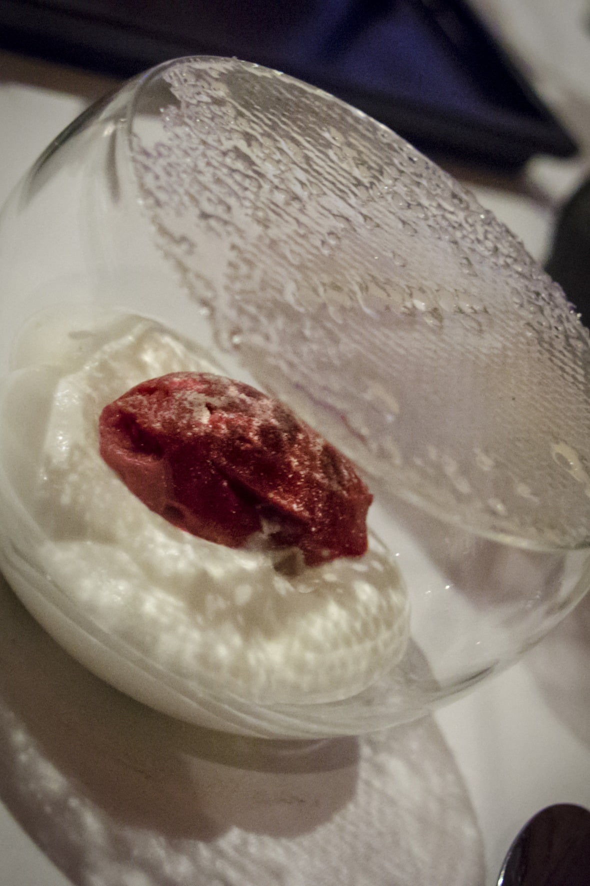 Pour terminer, une quantité impressionnante de desserts est servie: un arbre où des boules de barbe à papa sont accrochées, quelques petits gâteaux… aussi, un bol, au fond duquel sont installés une costarde et un sorbet de framboise, est couvert d’une croûte de sucre dur qui ferme le bol tel un couvercle. Il faut, à l’aide de la cuiller, fendre le sucre croquant, qui ajoute une texture au plat crémeux. J’étais évidemment en hâte d’y goûter et j’ai réussi à me couper le palais sur le sucre tranchant. C’est ma faute, je suis toujours si impatient!