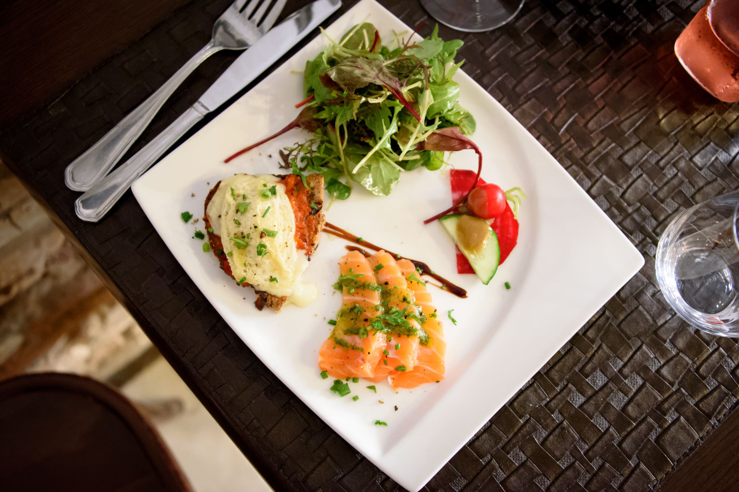 Comme premier plat, il y a le chèvre chaud et gravlax. Le chèvre est complètement coulant, délicieux. Le gravlax est délicat, gras, le goût de sel et de sucre parfois trop intense avec cette recette y est presque absent, le goût du poisson est très léger, et on se rapproche presque d’un sashimi tellement le poisson glisse en bouche. Superbe!