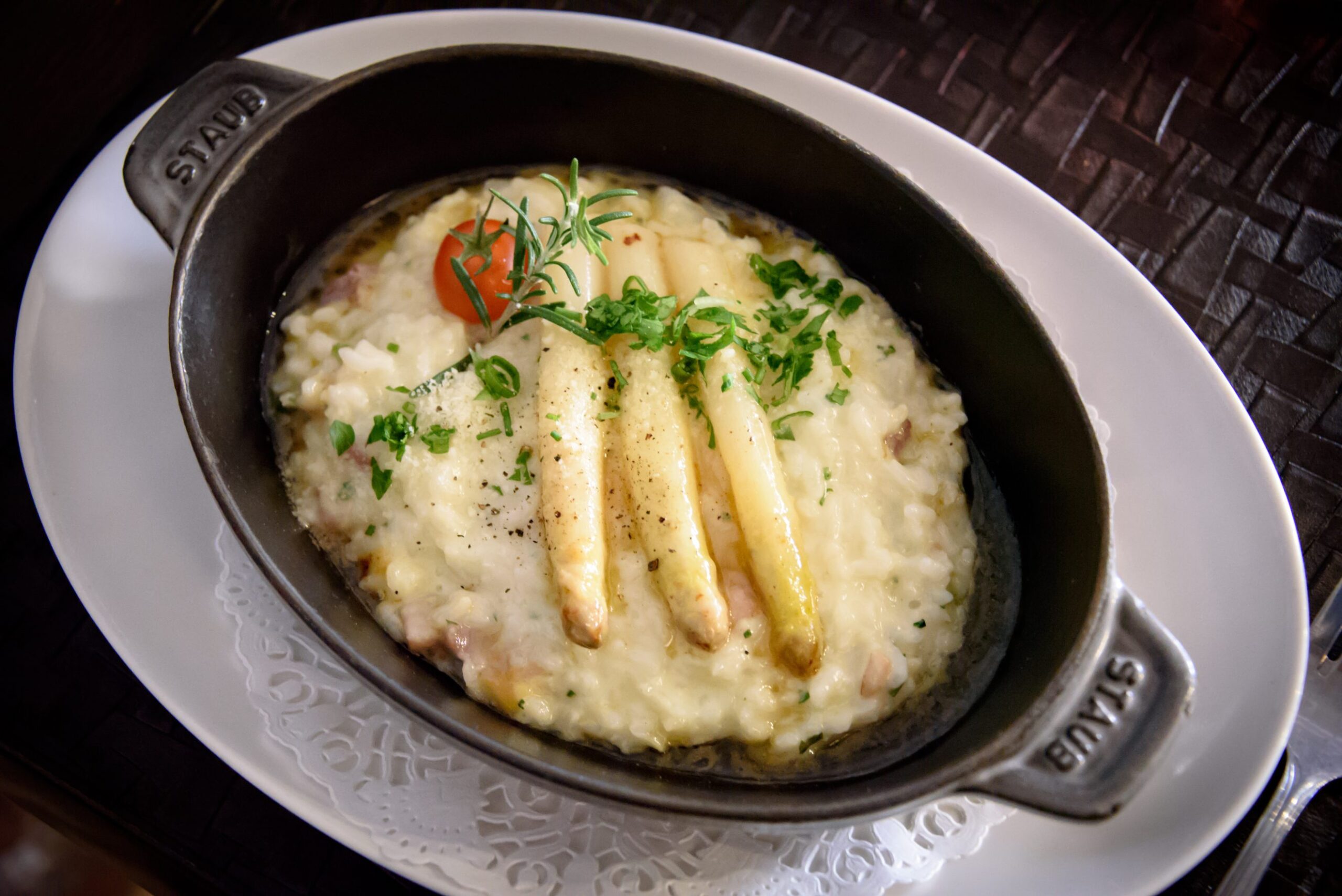 Ensuite, un risotto d’asperges est servi dans un plat en fonte chaud. C’est une attaque de fromage! Le riz, parfaitement cuit, est salé et extra-onctueux, et le vin, juste assez acidulé, s’avère un choix judicieux, puisqu’il coupe le gras du plat de riz. Peut-être un petit jet de jus de citron n’aurait pas fait de tort au plat, mais tout de même, il se laisse manger.