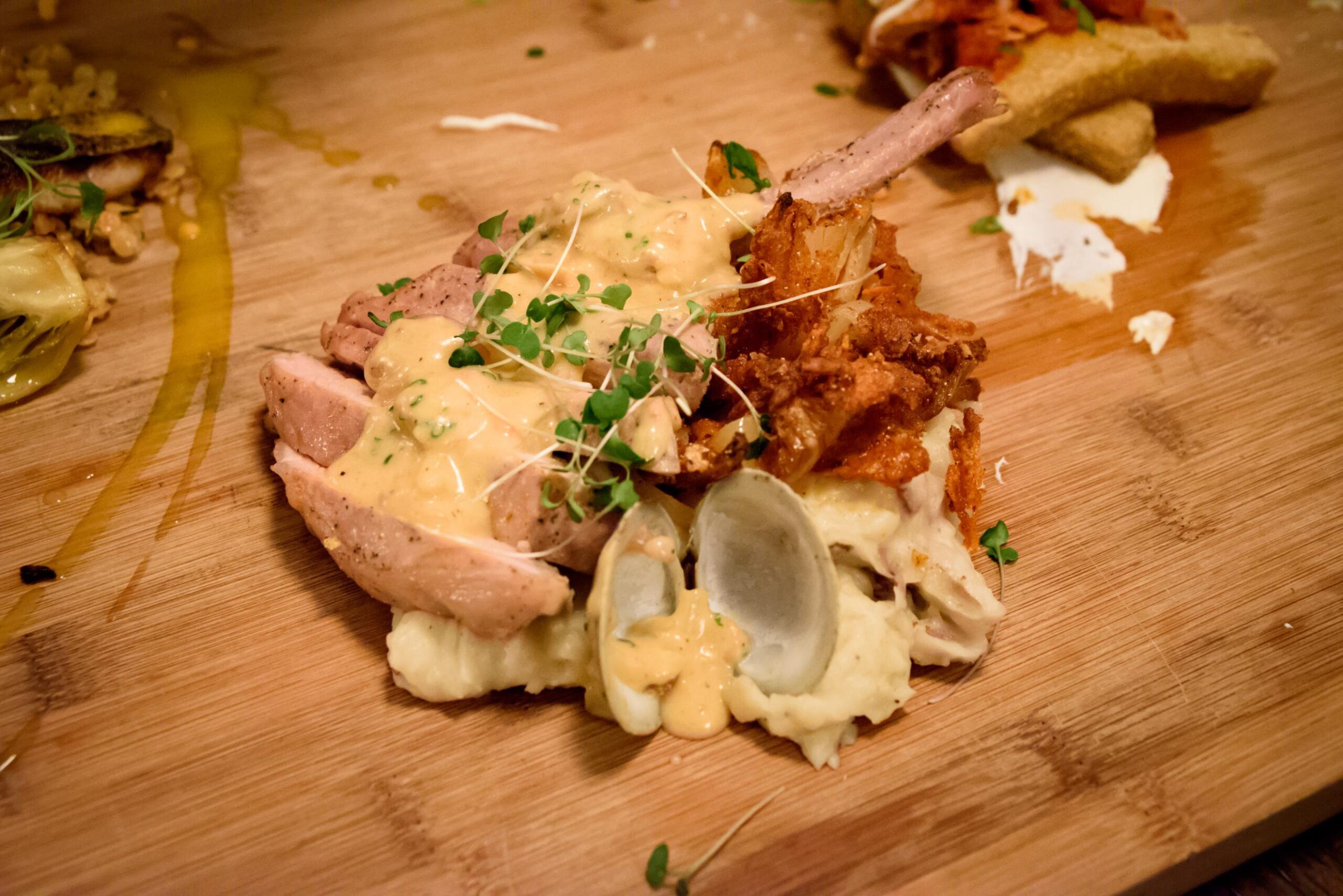 On y sert des « ailes de lapin », cuisses de lapin traitées comme des ailes de poulet; un « tartare pâté-chinois », c’est à dire du bœuf cru, quelques herbes et épices, du maïs en grain, le tout servi sur une chip.