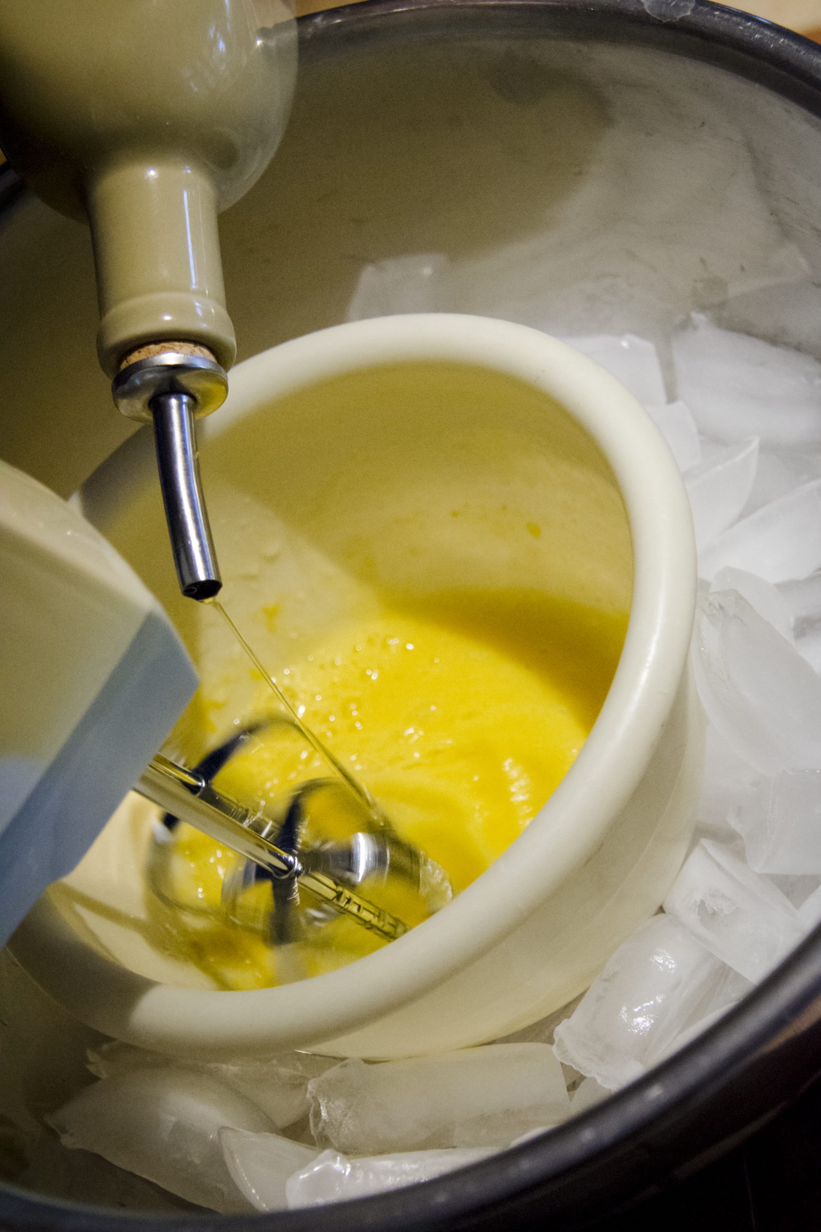 Mettez les deux huiles ensemble dans une bouteille à presser, ou dans n’importe quelle bouteille qui vous permet de verser l’huile d’un mince filet, constant et lent.