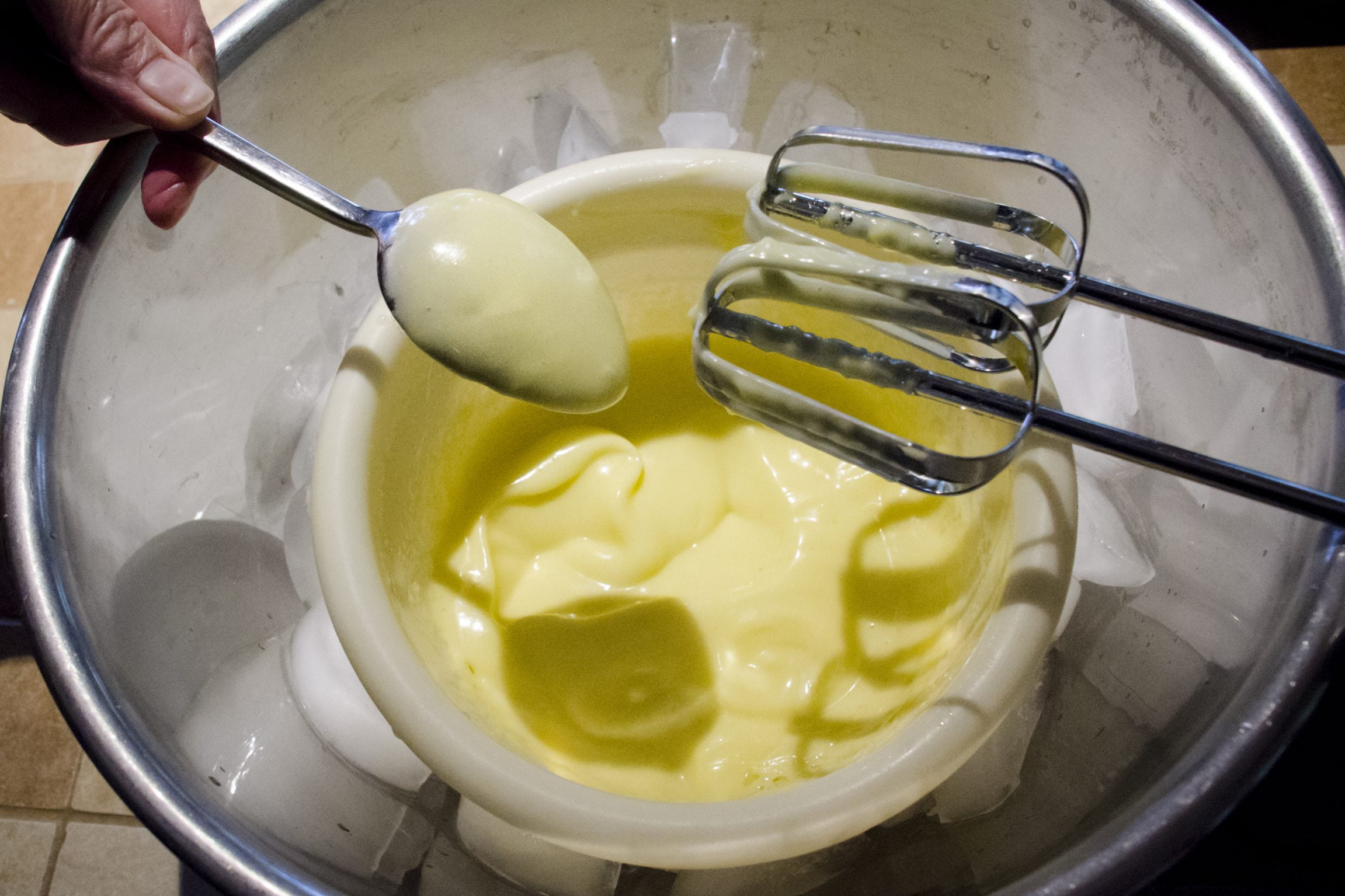 Puis, laissez la mixette dans la mayonnaise, au maximum, pendant 30 secondes. Cette opération permet d’épaissir la mayo. Ne dépassez pas 30 secondes, cependant.