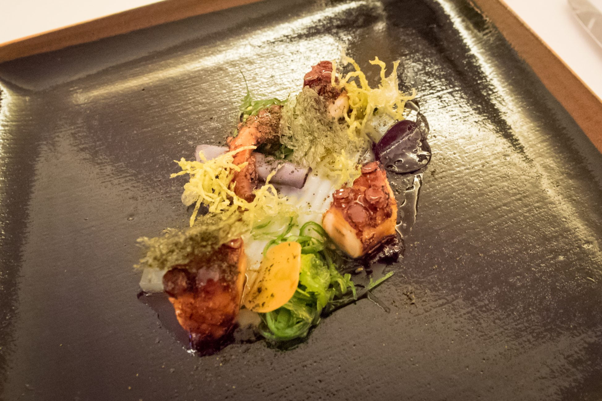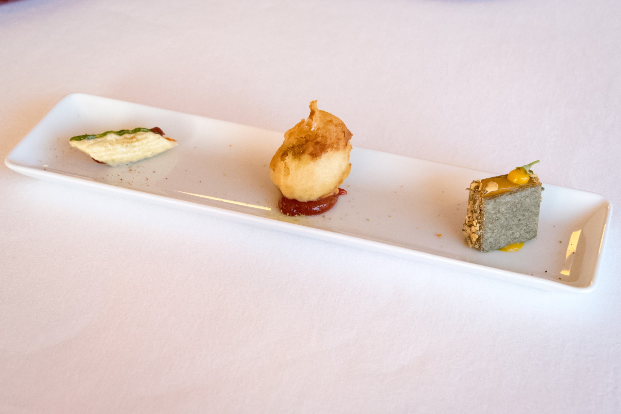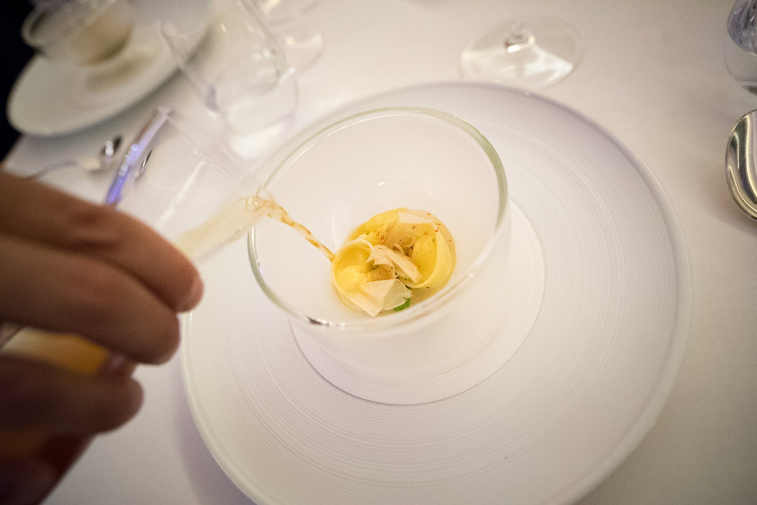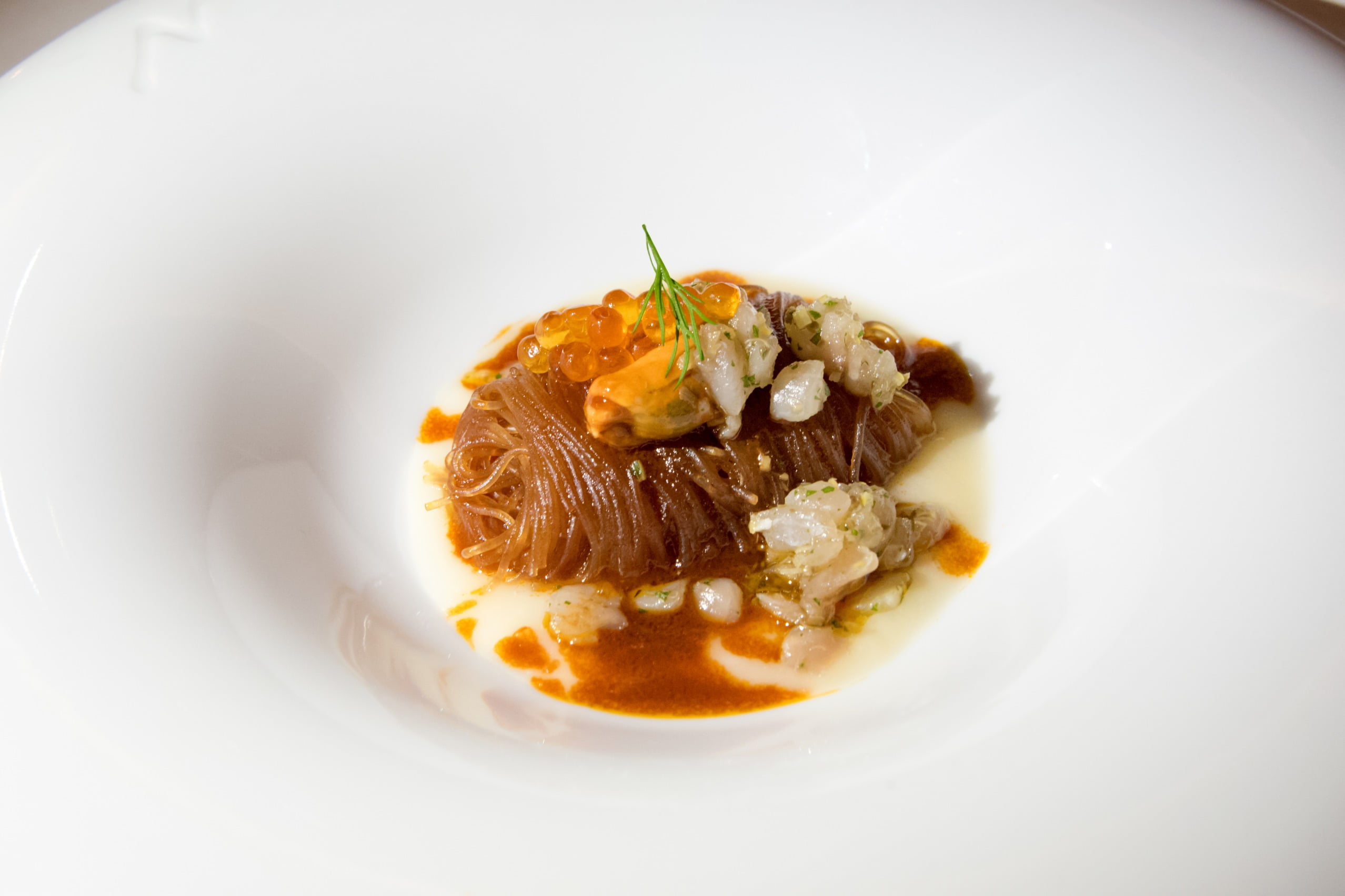 Le plat de ravioli offre une expérience similaire : les raviolis sont servis dans un dashi de bonite; un « jus » de parmesan est enfermé dans le ravioli lui-même, et les pâtes sont d’une texture extrêmement délicate. Je ne peux pas m’empêcher de le comparer au carbonara de chef Heinz Beck, son plat signature. Le soupçon d’arômes japonais est aussi subtil qu’il est important, comme si sa présence nous assurait que nous mangeons au restaurant de chef Apreda, et nulle part ailleurs.