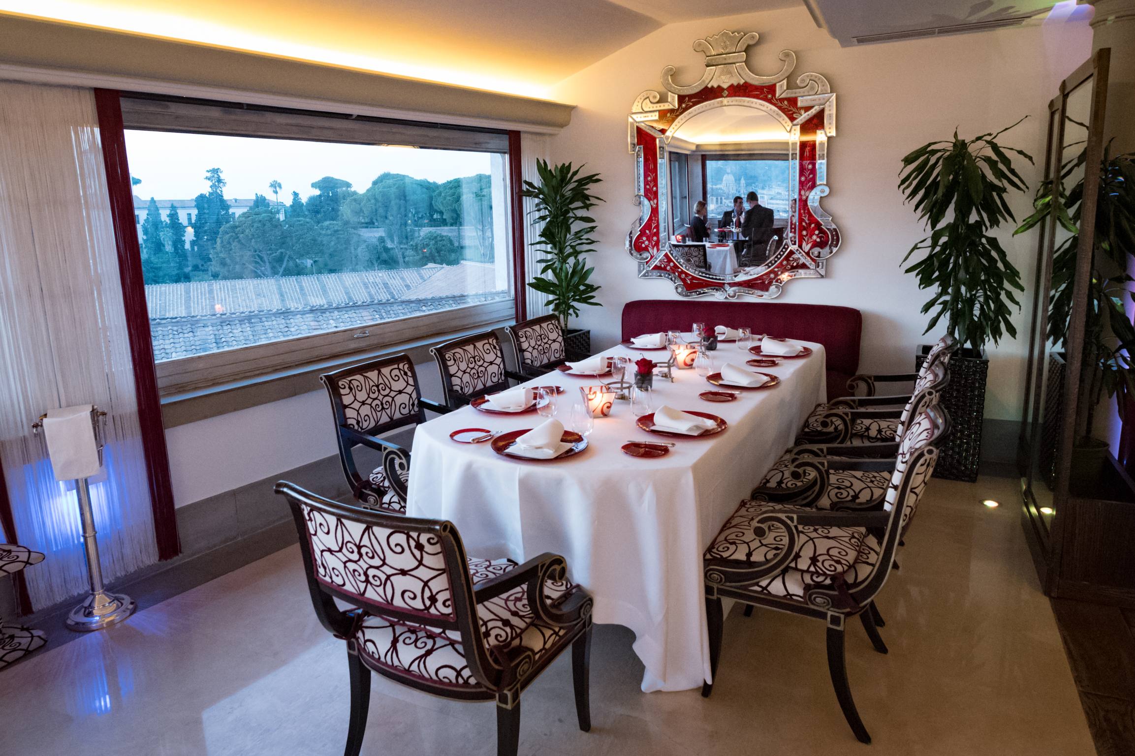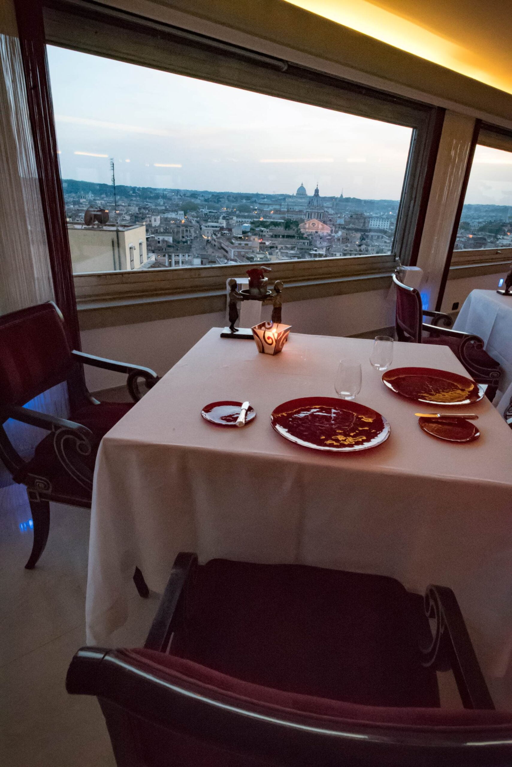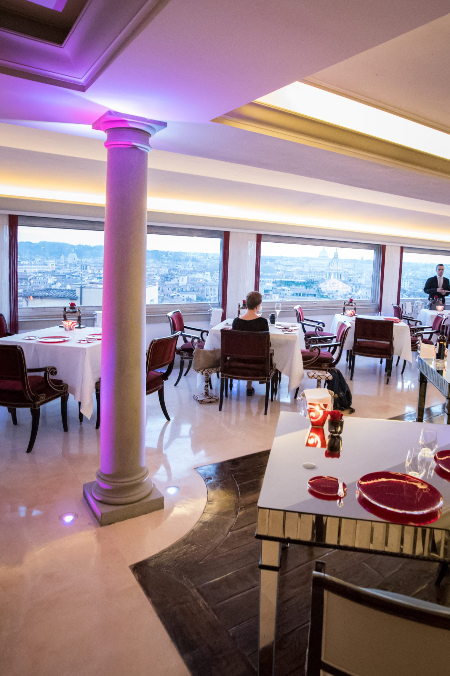 Et puis, il y a la salle à manger elle-même. Le restaurant Imago est situé dans le Hassler, au dernier étage, et donne sur les marches espagnoles. Il n’y a pas plus central – et touristique! C’est un hôtel emblématique, et la décoration des chambres et de l’hôtel lui-même tendent vers la vieille-garde, vers un style qui n’a pas d’âge. Le restaurant, cependant, a un look un peu étrange, rappelant le début des années 2000, avec des lasers violets projetés des pieds de colonnes de style romain.