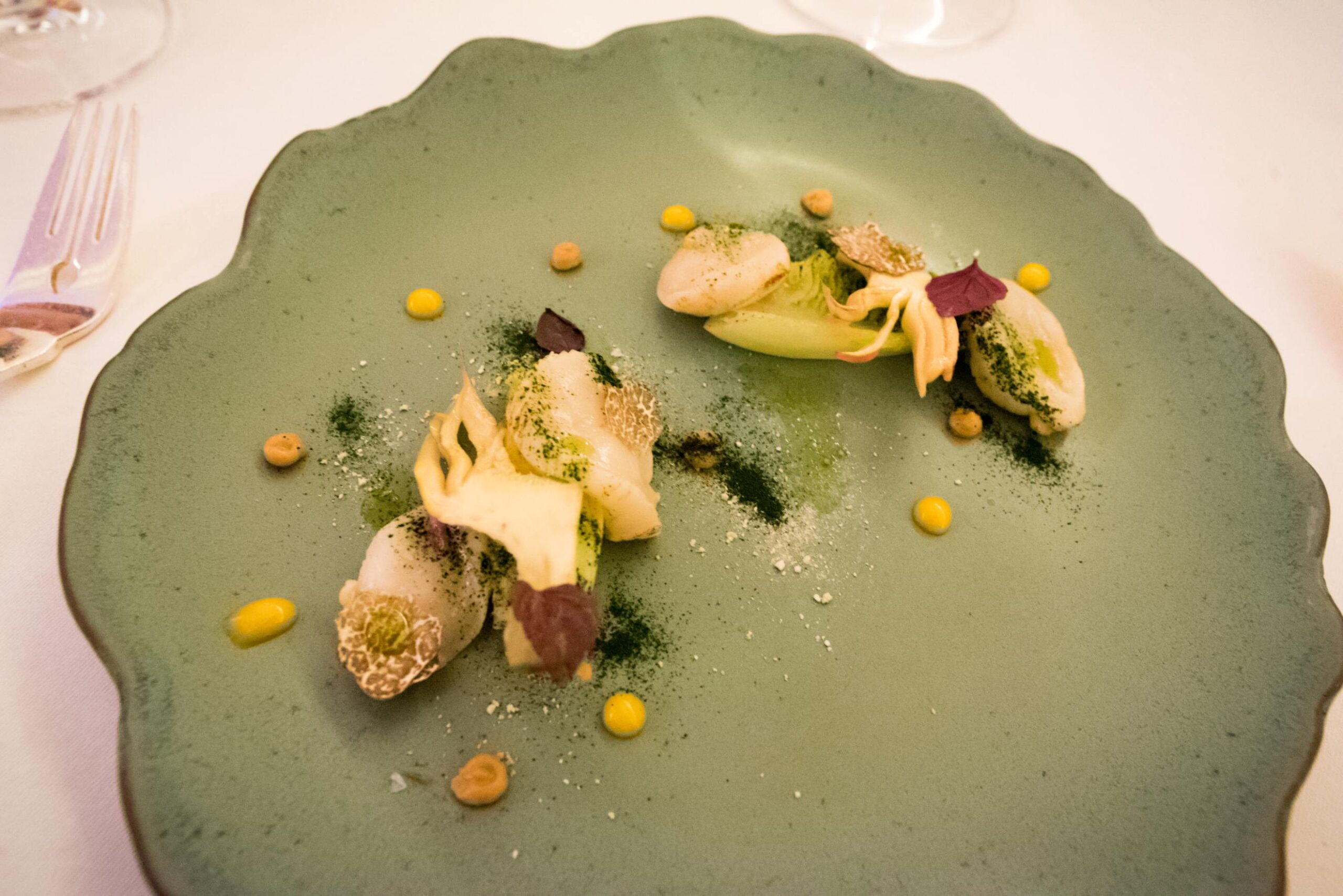 Le plat de pétoncle servi en début de repas exemplifie à merveille le travail de M. Apreda. Les pétoncles semblent fumés; de la poutargue est râpée, de haut, par-dessus le plat, ce qui offre un assaisonnement aux notes d’umami et de miso salé; de la truffe noire, des poireaux et des artichauts complètent. Les ingrédients italiens et les influences japonaises sont tous deux à l’avant-plan. Et ce plat particulier est ramené à l’essentiel grâce au vin qui l’accompagne, un (très local) Frascati Villa Simone Vigneto Filonardi, 2014. À ma grande surprise, le vin sent le bubblegum, mais ne goûte rien de tel. En fait, une fois en bouche, la combinaison renvoie toute la fragrance du plat vers ses origines: la mer.