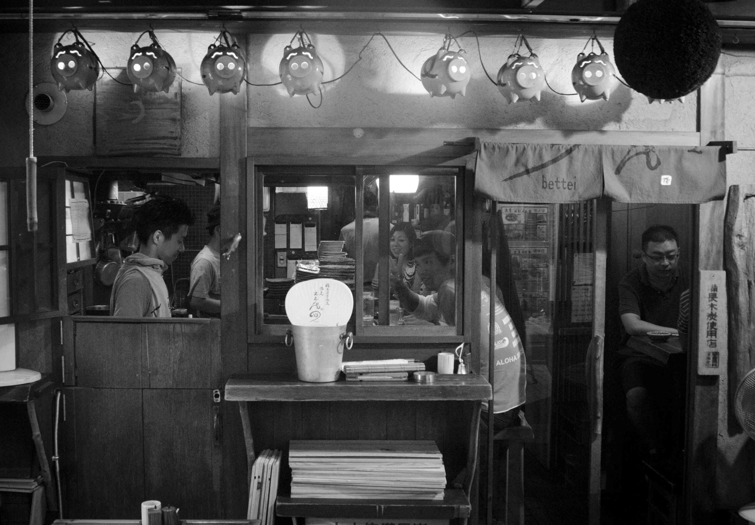 Mon institution préféré au Japon, c’est l’izakaya, ces petites tavernes où l’on sert de grandes quantités de bière – Asahi, Kirin, ou la plus houblonnée Suntory Premium Malt’s – de shochu ou de saké. Et on y grille toutes les parties de pratiquement tous les animaux, en brochettes, sur du charbon de bois.