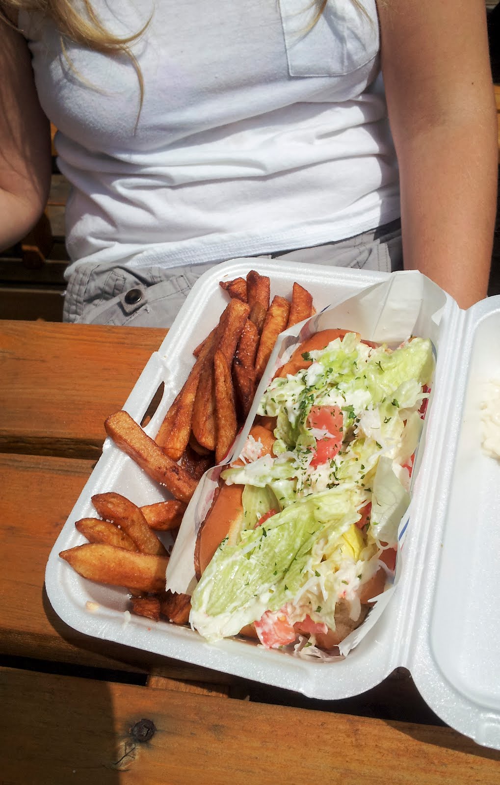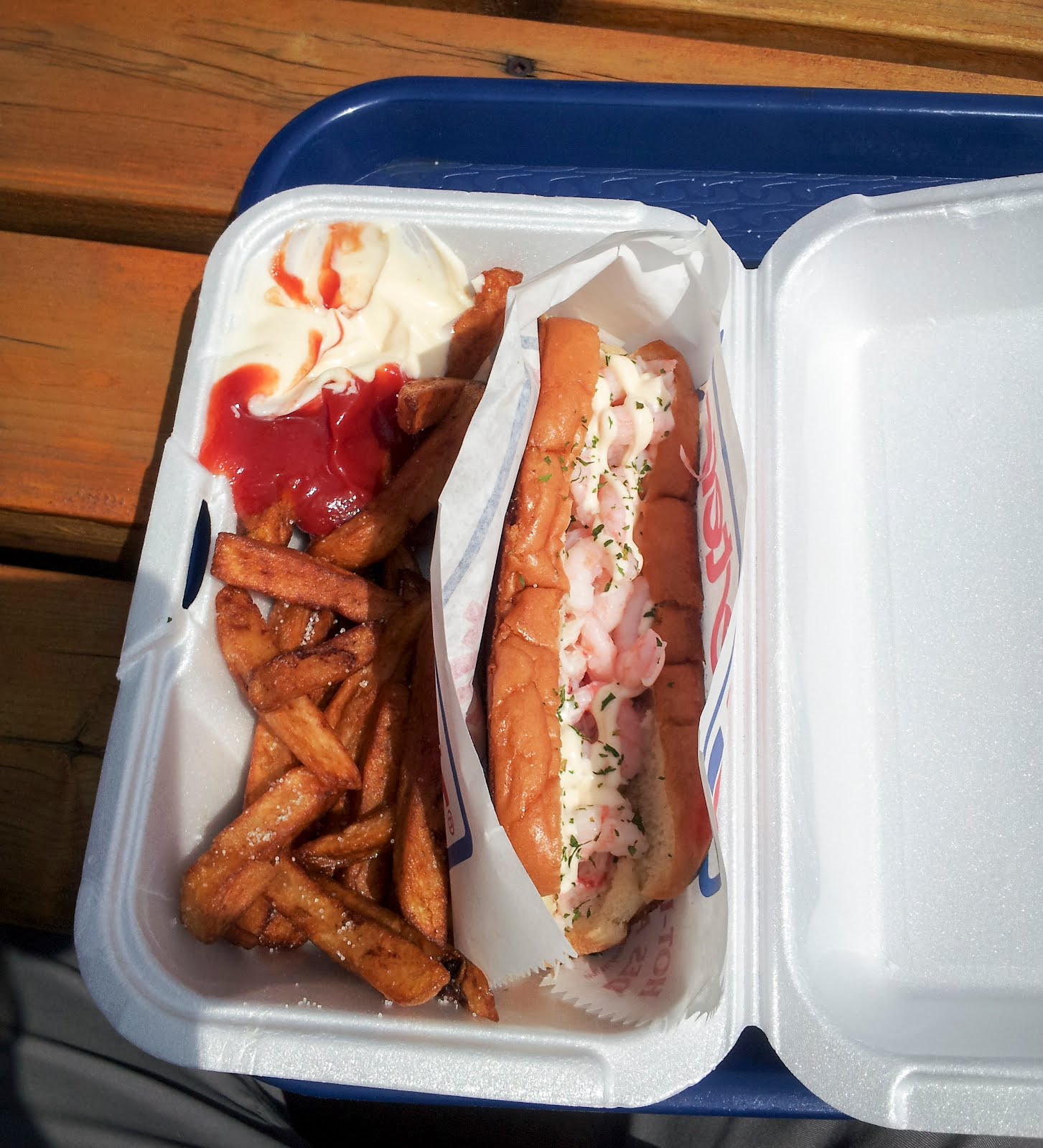 Malgré la tentation incroyable suscitée par cette incongruité, on opte plutôt pour la guedille crabe-crevette, la guedille au homard et la frite maison. Verdict: la guedille crabe-crevette, simpliste, dépasse les attentes. Comparable au lobster roll goûté au Maine, la combinaison de crevettes et de crabe (locaux, évidemment) avec un tout petit peu de mayo permet aux saveurs des fruits de mer de se révéler.