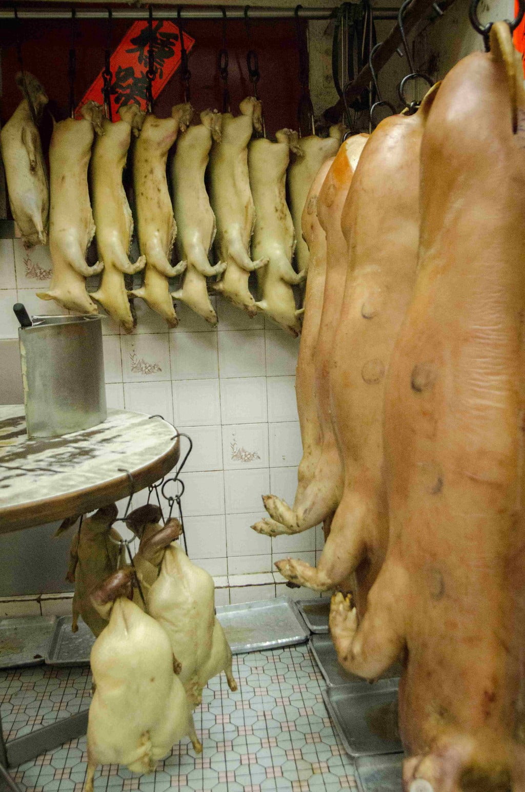In a small dirty white room, the decor is shocking: daddy piggy, mommy piggy and seven suckling pigs are hung up to dry, like t- shirts out of the wash, right there in the dining room. To the left of the entrance, a few whole geese are also drying, hanging from their twisted necks. Nobody asks “What’s for dinner?” It’s pretty obvious. There will be no vegetables on the menu tonight.