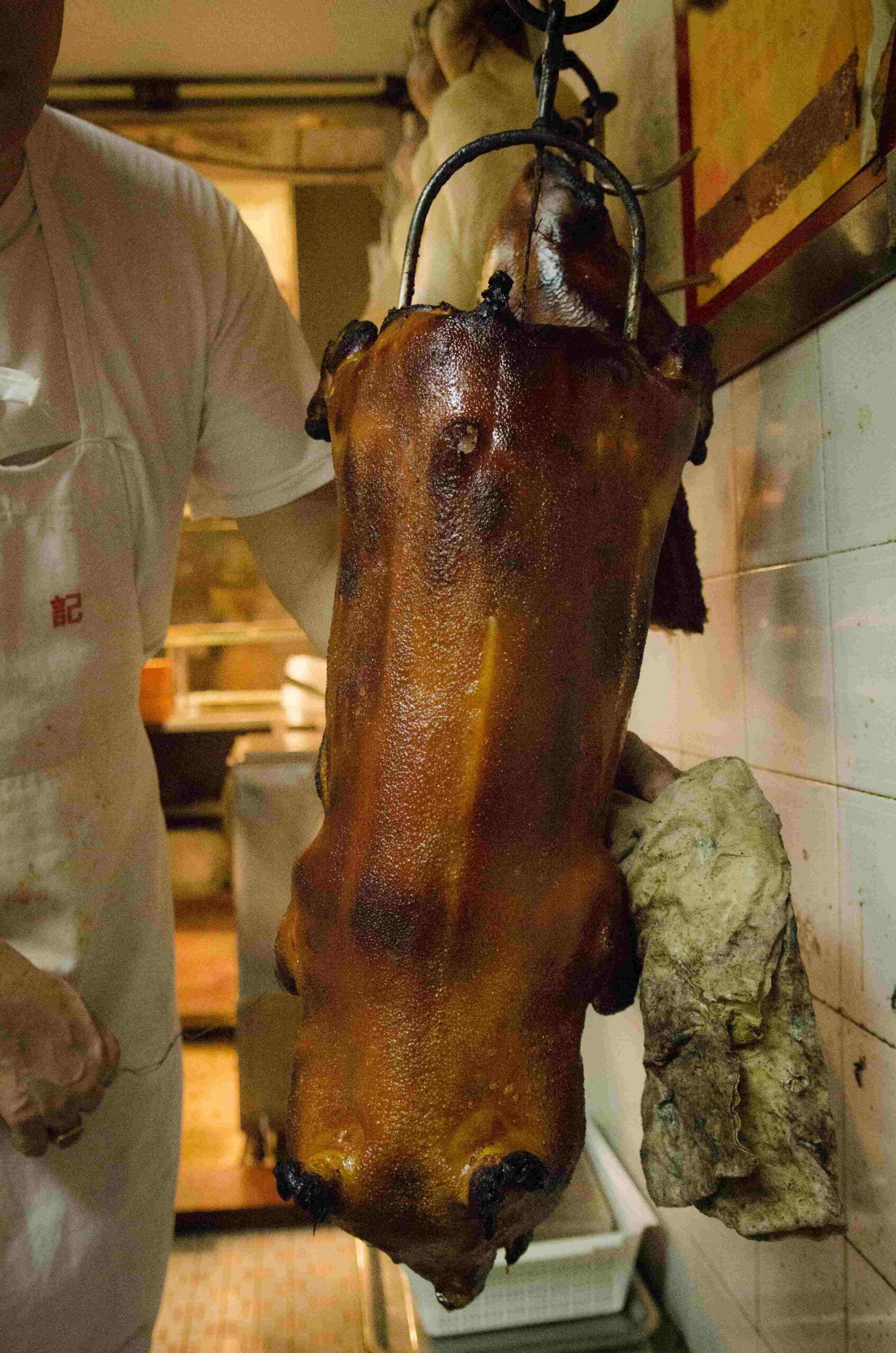 After a short wait, Babe has a different look. The white hairless skin, comparable to the rest of his family still hanging, has become brown and golden under the influence of the torch. And the smell of the dark brown caramelized skin turns your mouth into the Niagara Falls of saliva. A few violent and expert machete chops; bones crack, skin splits, flesh separates perfectly. The man places flawlessly cut mouthfuls of meat – shoulder, butt, ribs, belly – on a large plate, then sits the head of your dinner comfortably on the pile of meat. He then brings it along with chopsticks, soy sauce, hoisin sauce and a bittersweet condiment. And another round of beers.