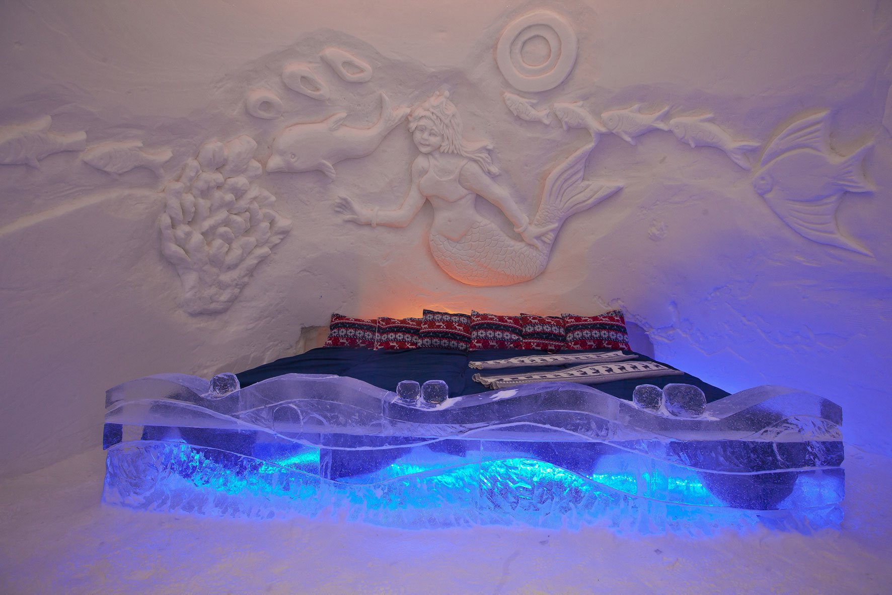 The ceilings, walls, tables, chairs, and even the beds, are all made of snow and ice, by artisans with fantastic techniques. And their creations are always most impressive. These are true architectural wonders!