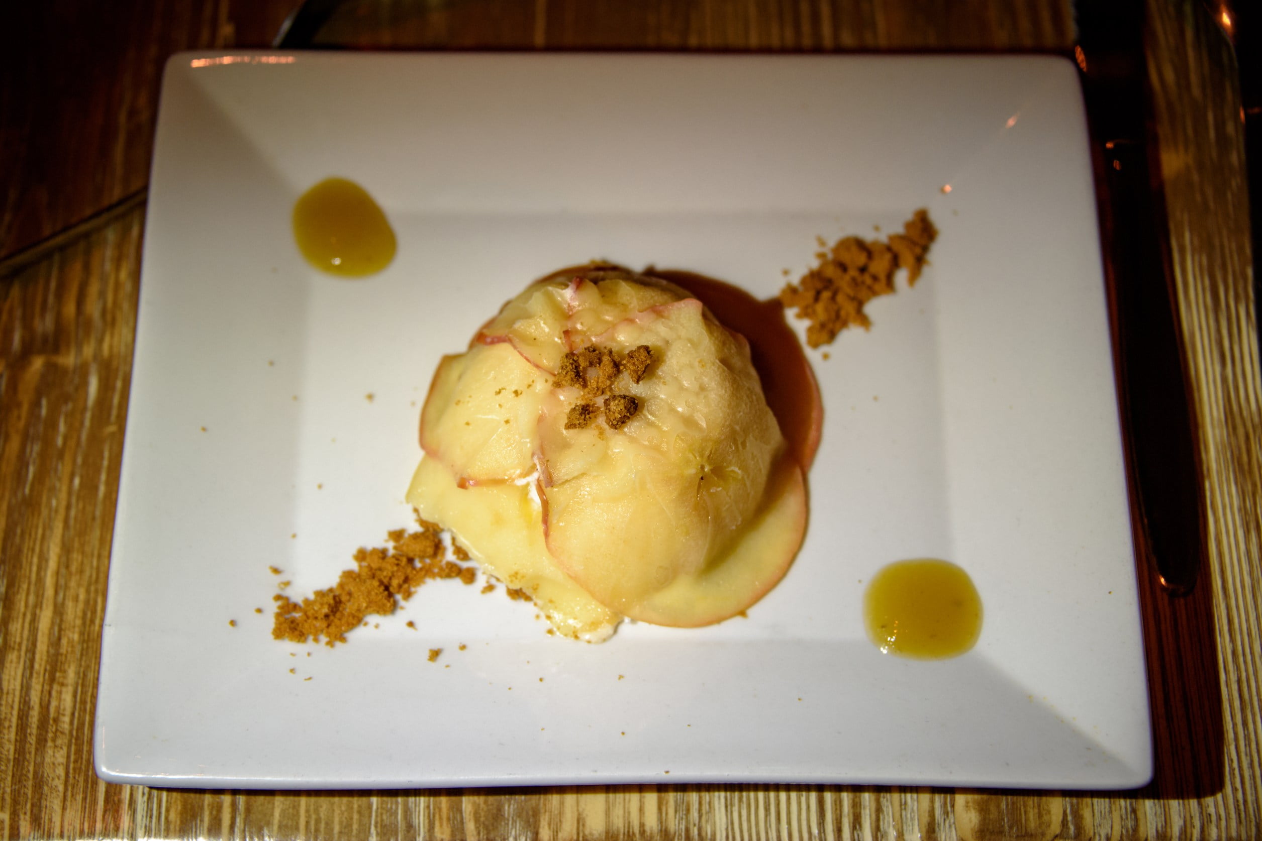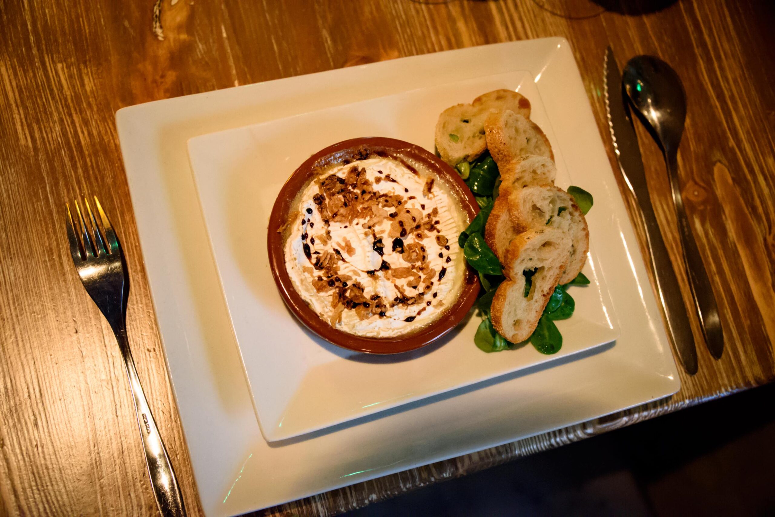Chef Cédric Delaux offers a roasted camembert that’s full of imagination: he fits an entire camembert in a clay ramekin, then puts it in the oven. The result: almost a Swiss fondue made with camembert … almost. Not bad!